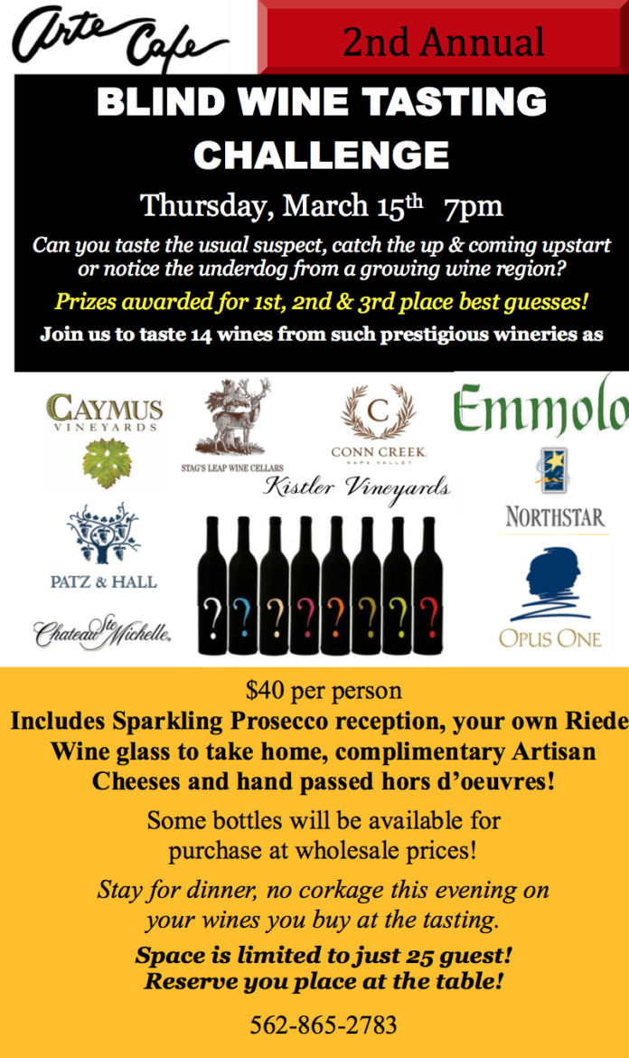 Join Arte Cafe in Cerritos for their second annual blind wine tasting challenge! There will be prizes awarded to 1st, 2nd, & 3rd place in the challenge — come taste wines from 14 different wineries, such as Emmolo, Conn Creek, & more.