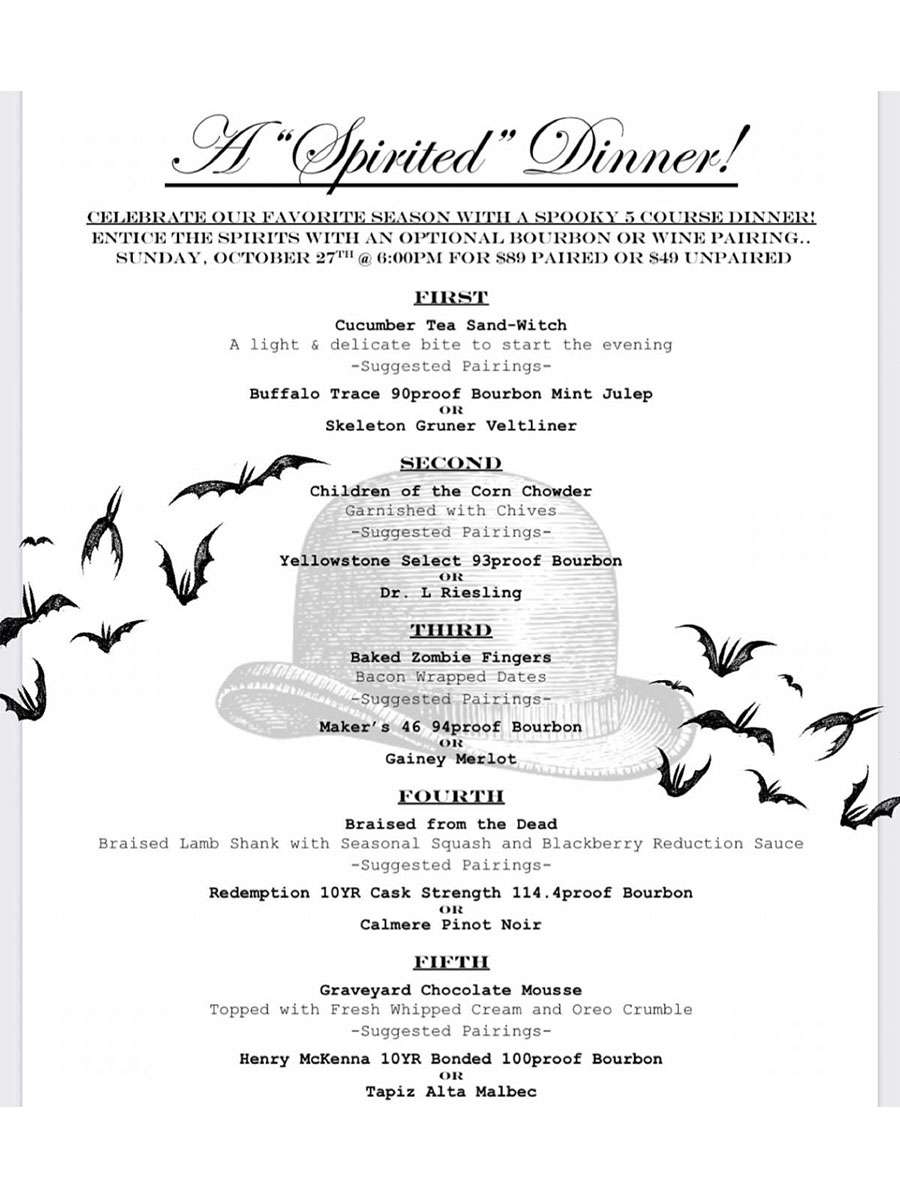 Celebrate their favorite season with a spooky 5 course dinner! Entice the spirits with an optional bourbon or wine pairing.