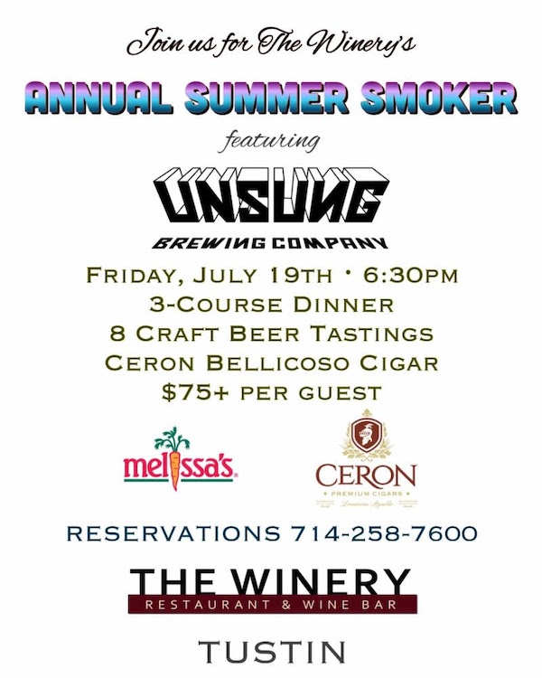 Join the Winery Restaurant and Bar in Tustin for their annual summer smoker, featuring Unsung Brewing Company!