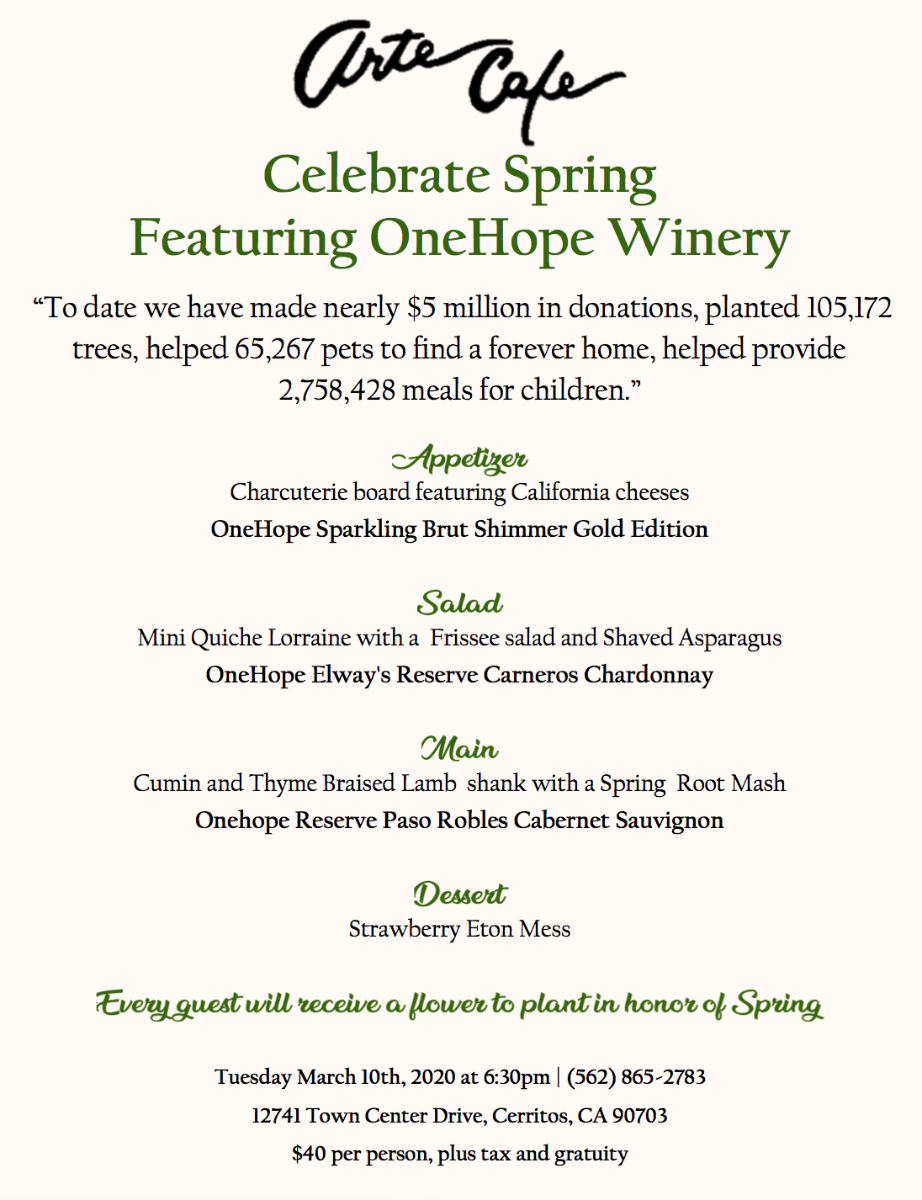 Celebrate Spring featuring OneHope Winery at Arte Cafe! Every guest will receive a flower to plant in honor of Spring.