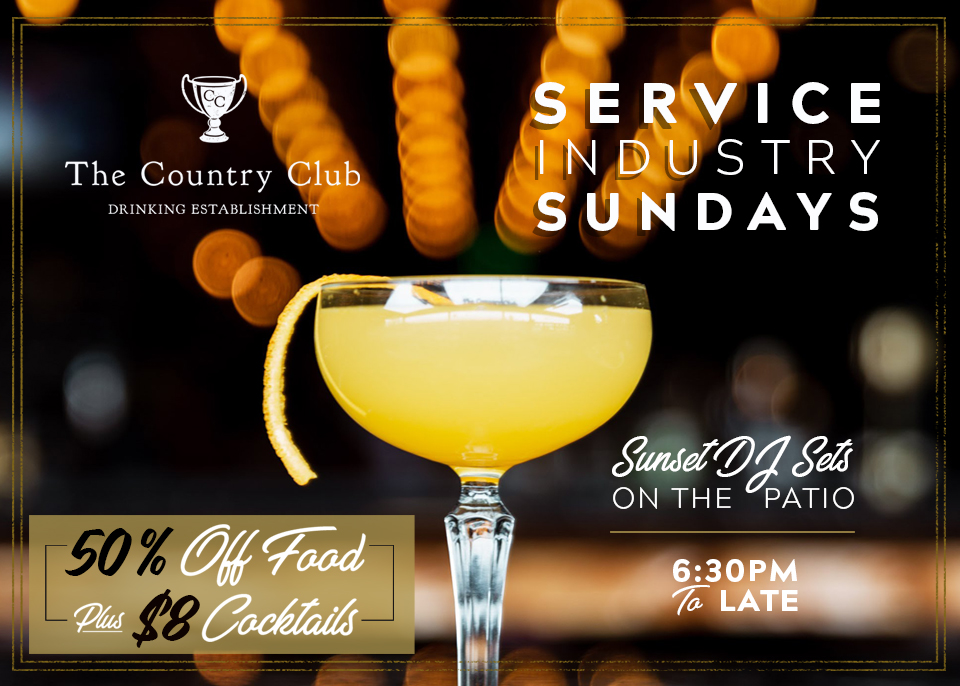 It’s time you relax and let The Country Club take care of you. Enjoy 50% off all food and $8 craft cocktails from 6:30 pm. Feel the vibe with Sunset DJ sets on the patio.