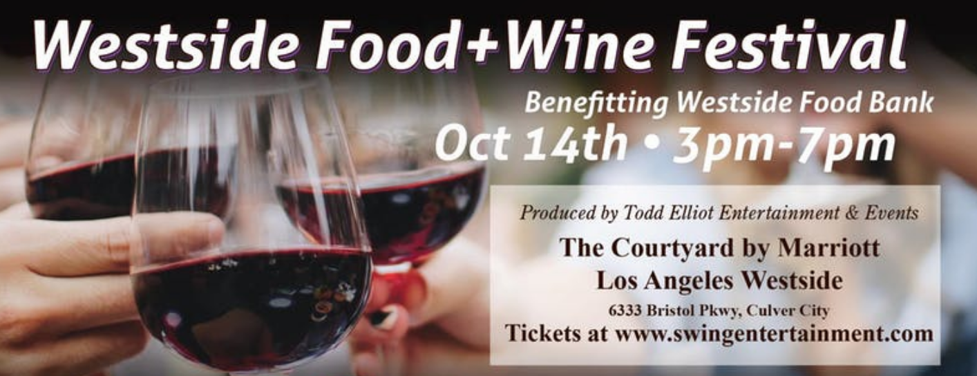 The 2nd Annual Los Angeles Westside Food & Wine Festival benefitting The Westside Food Bank. The October 14th Fall Food & Wine Festival will be held at the Courtyard by Marriott LA Westside (same place as last year’s Culver City Centennial Food & Wine Festival) at 6333 Bristol Pkwy, Culver City, CA 90230. This event will take place in their Palisades Ballroom & Patio + outside back parking lot. 3pm Vip Entry and 4pm General Admission. Festival goes till 7pm
