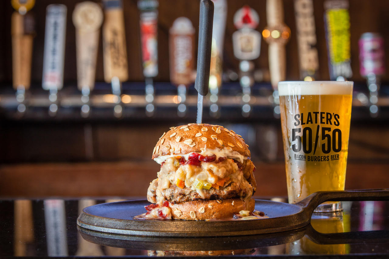 Slater’s 50/50 is putting all the flavors of the holidays in your hands with the return of an annual favorite: the Thanksgiving Burger! The seasonal item features a turkey patty piled high with brioche stuffing, turkey gravy, house-made cranberry sauce, and garlic and sage aioli on a honey wheat bun. The Thanksgiving Burger is available for $14.99 at all Slater’s 50/50 locations from November 1 – December 31, 2018.