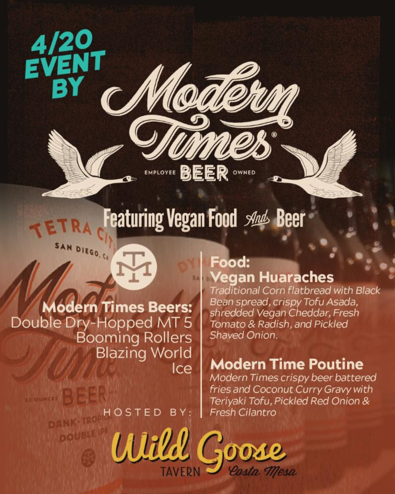 Roll into the goose bar for a 420 feast of unbelievably tasty vegan fare and modern times liquid gold! Wild Goose will be one of the ONLY bars in Orange County tapping Double Dry-Hopped MT5.