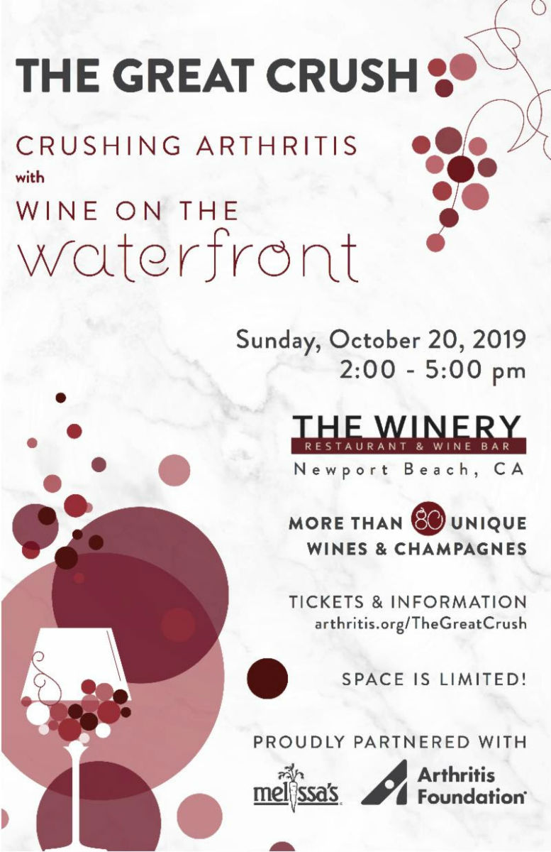 The Winery Restaurant & Wine Bar presents “The Great Crush” fundraiser on Sunday, October 20, 2019 from 2 p.m. – 5 p.m. at its waterfront location benefiting the Arthritis Foundation in Newport Beach. The event, formerly known as “Sunday in the Vineyard,” will feature a wine tasting with more than 80 wines, many of which are considered unique finds from boutique wineries spanning the globe. Guests will also have the opportunity to partake in an early tasting during a Yacht Tour through the Newport Marina prior to the main event. The fundraiser will include a sampling of passed hors d’oeuvres by The Winery’s Executive Chef and Partner, Yvon Goetz, along with live and silent auctions.
